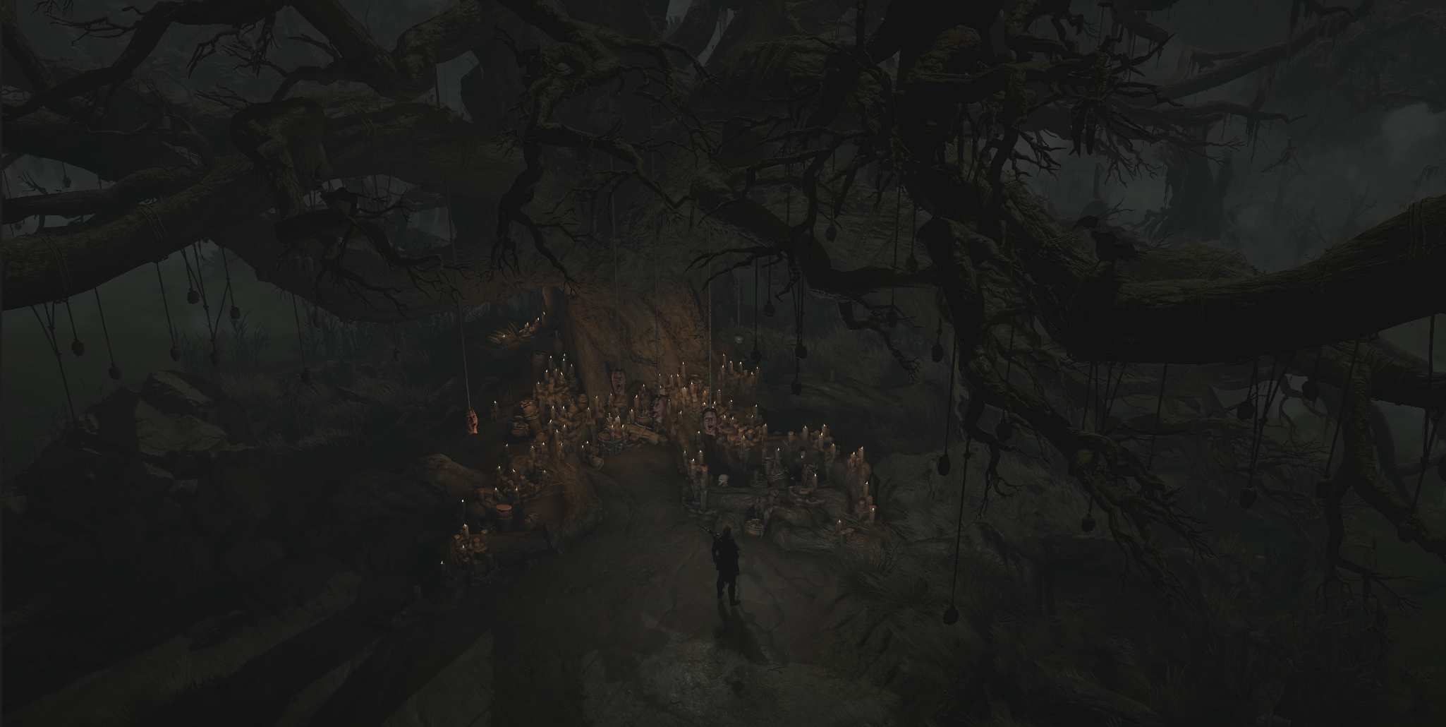 地圖上顯示的耳語之樹經常有所謂的世界目標週期性地變化,它們會給你經驗值、金幣和一定數量的冷酷之愛(Grim Favor)。你可以在耳語之樹交換 10 個冷酷之愛(Grim Favor),獲得各種戰利品和經驗值。